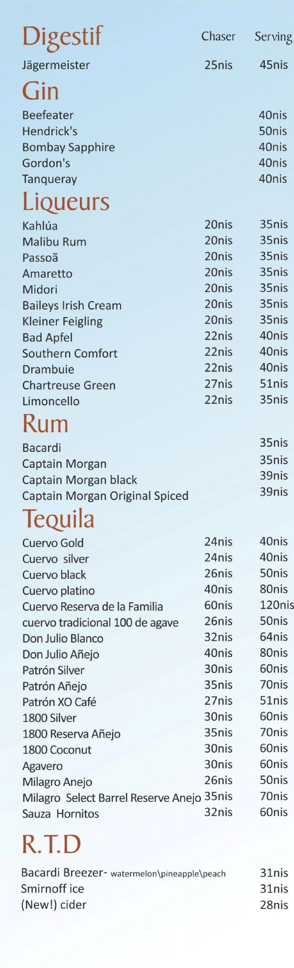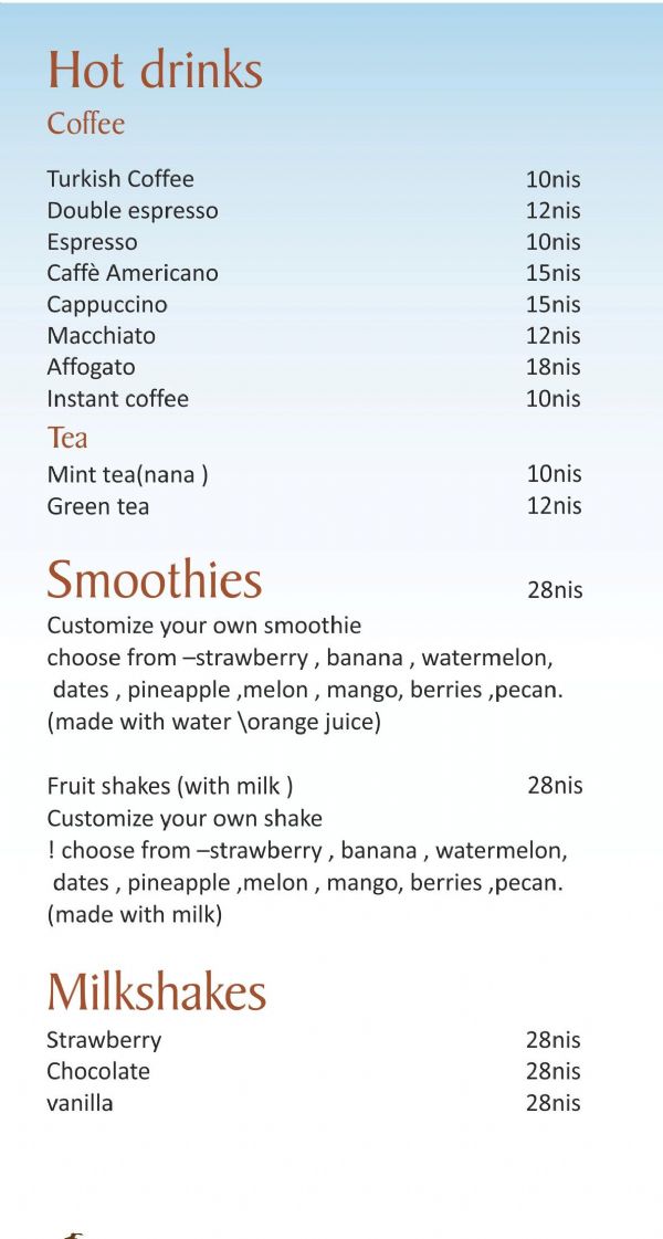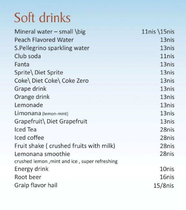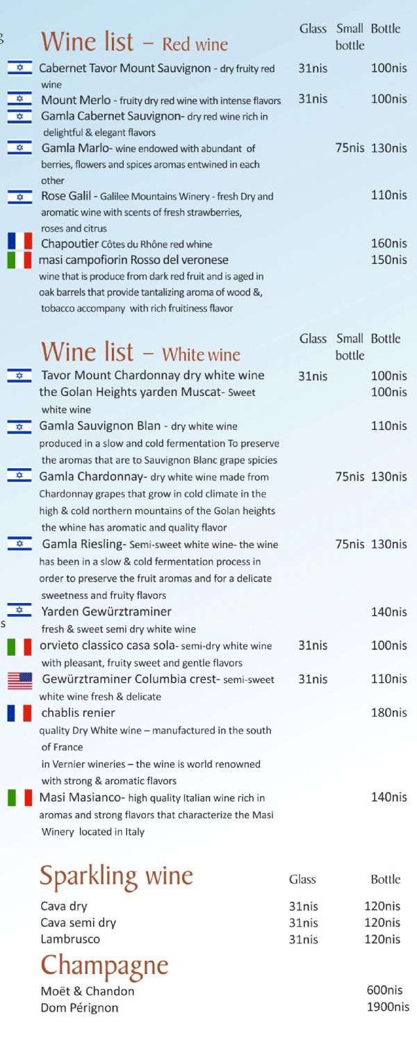 bora bora beach - Sea of Galilee - Drinks Menu